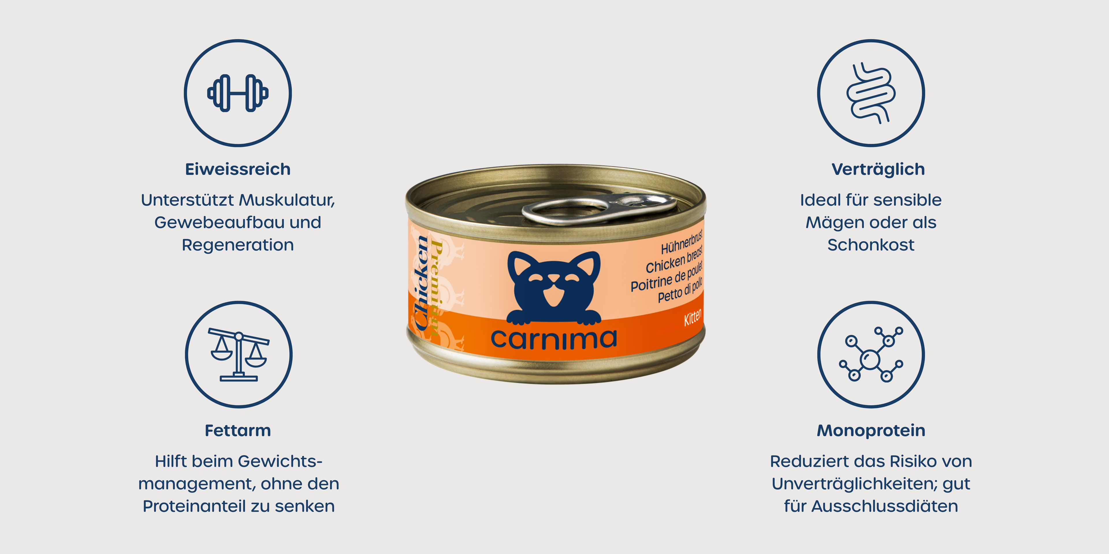 Carnima Hühnerbrust in Gelee ist ein 100 % natürliches Nassfutter, speziell abgestimmt auf die Bedürfnisse von Kätzchen. Hochwertiges, echtes Fleisch in feinem Gelee unterstützt eine artgerechte Ernährung.