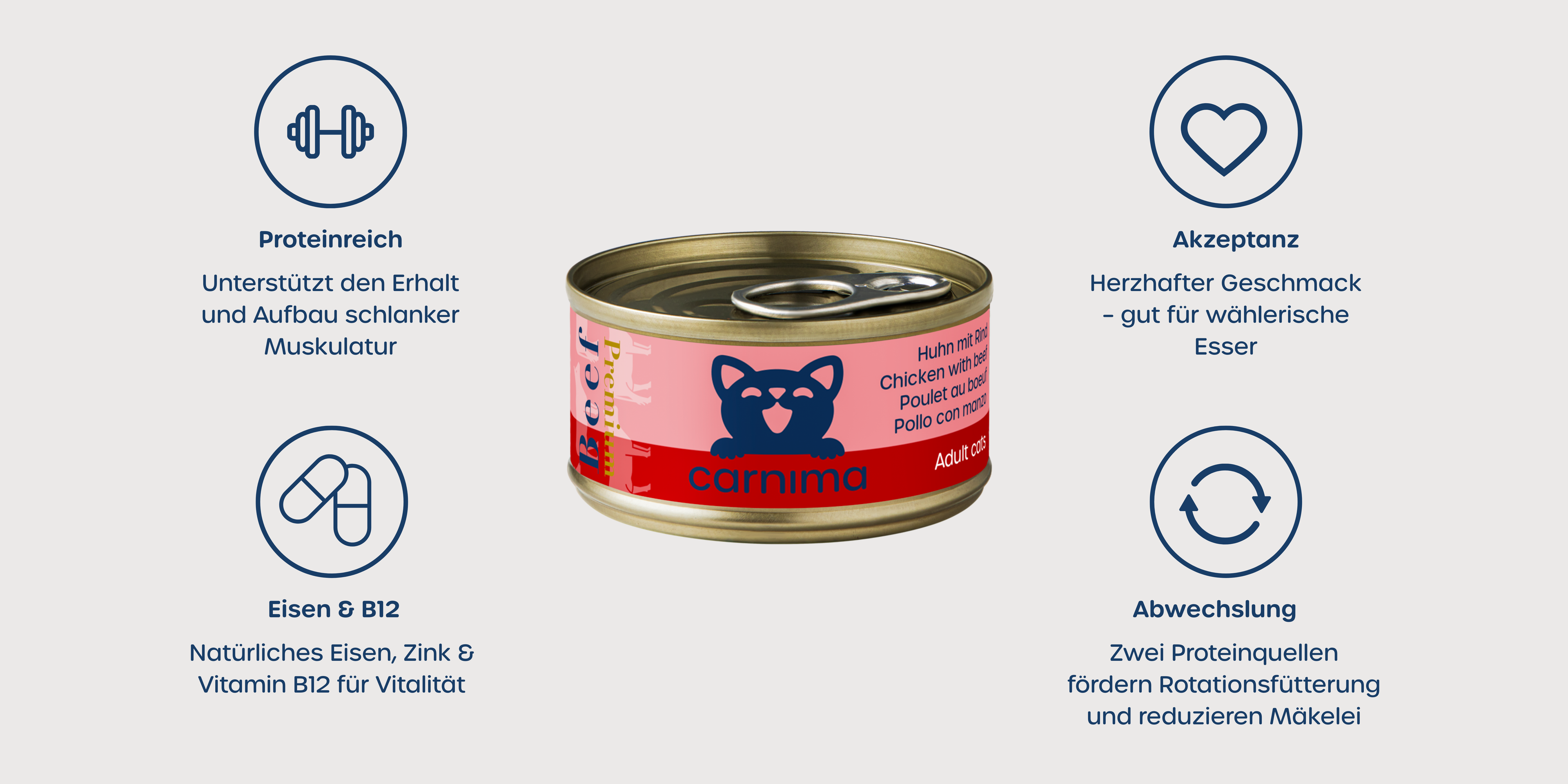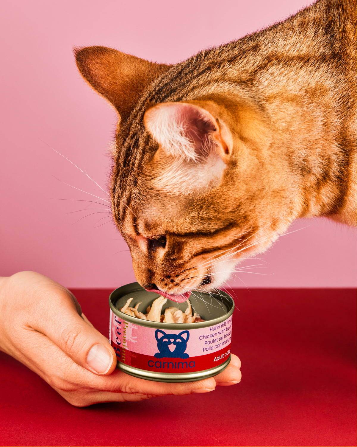 Beginne mit kleinen Mengen Carnima, die du unter dem gewohnten Futter mischst. Erhöhe den Carnima-Anteil Schritt für Schritt, bis deine Katze vollständig umgestellt ist. Halten Sie die Portionen moderat, füttere zu festen Zeiten und beobachte Verhalten, Appetit und Kotbeschaffenheit.