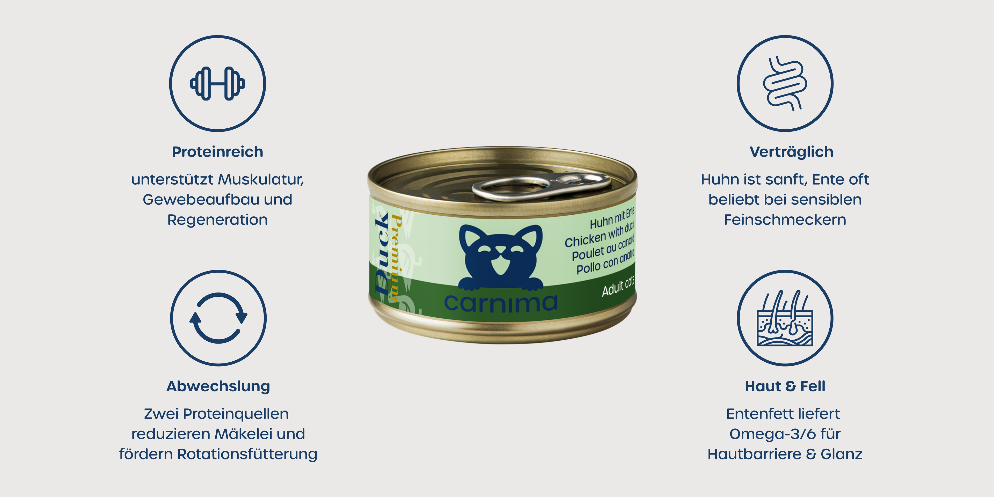 Carnima Hühnerbrust mit Ente in Hühnerbrühe ist ein 100 % natürliches Nassfutter, speziell abgestimmt auf die Bedürfnisse erwachsener Katzen. Hochwertiges, echtes Fleisch in feiner Brühe unterstützt eine artgerechte Ernährung.